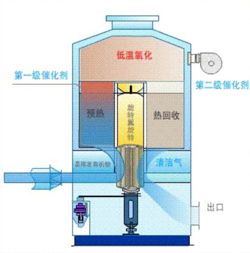 在将废气进行催化净化的过程中,废气经管道由风机送入热交换器,将废气加热到催化燃烧所需要的起始温度。经过预热的废气,通过催化剂层使之燃烧。由于催化剂的作用,催化燃烧法废气燃烧的起始温度约为250~300摄氏度,大大低于直接燃烧法的燃烧温度650~800摄氏度,高温气体再次进入热交换器,经换热冷却,最终以较低的温度经风机排入大气。